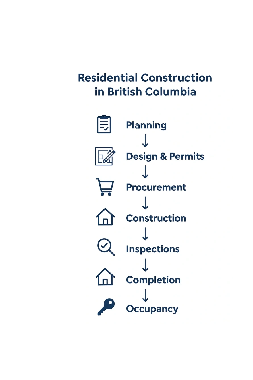 Building a residential home in BC follows a structured process to ensure safety, durability, energy efficiency, and full compliance with local regulations. We work with homeowners, municipalities, engineers, and trades through each stage from planning and permitting to construction & final occupancy.